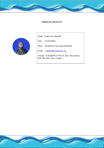 BIODATA PENULIS Nama : Salma Nur Hanifah Nim : A510220041 Prodi : Pendidikan Guru Sekolah Dasar Email : salmatata03@gmail.com Alamat : Tohudan Rt 15 Rw 03, Kec. Banyudono, Kab. Boyolali, Jawa Tengah