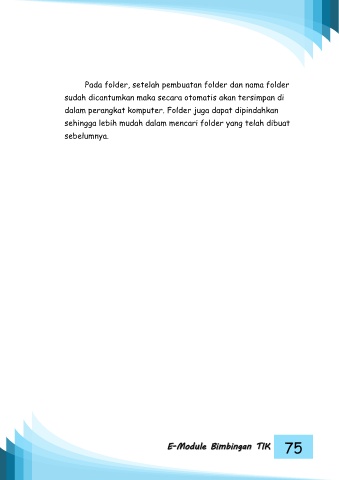 Pada folder, setelah pembuatan folder dan nama folder sudah dicantumkan maka secara otomatis akan tersimpan di dalam perangkat komputer. Folder juga dapat dipindahkan sehingga lebih mudah dalam mencari folder yang telah dibuat sebelumnya. 75