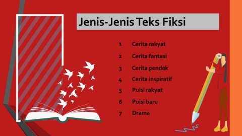 Jenis-Jenis Teks Fiksi 1 Cerita rakyat 2 Cerita fantasi 3 Cerita pendek 4 Cerita inspiratif 5 Puisi rakyat 6 Puisi baru 7 Drama