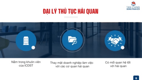 ĐẠI LÝ THỦ TỤC HẢI QUAN Nằm trong khuôn viên Thay mặt doanh nghiệp làm việc Có mối quan hệ tốt của ICDST với các cơ quan hải quan với hải quan 18