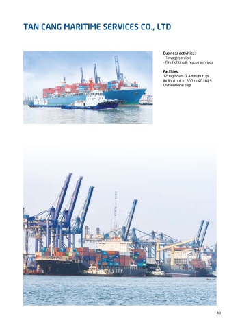 TAN CANG MARITIME SERVICES CO., LTD Business activities: - Towage services - Fire fighting & rescue services Facilities: 12 tug boats: 7 Azimuth tugs (bollard pull of 300 to 40 kN) 5 Conventional tugs 49