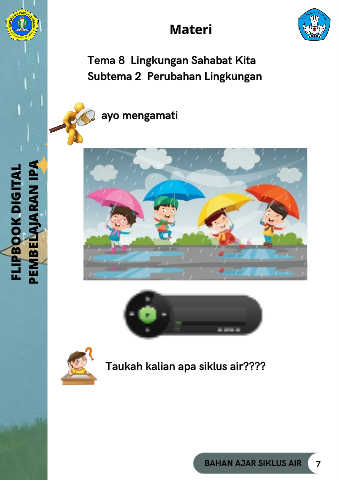 Materi FLIPBOOK DIGITAL Tema 8 Lingkungan Sahabat Kita Subtema 2 Perubahan Lingkungan ayo mengamati PEMBELAJARAN IPA FLIPBOOK DIGITAL Taukah kalian apa siklus air???? BAHAN AJAR SIKLUS AIR 7