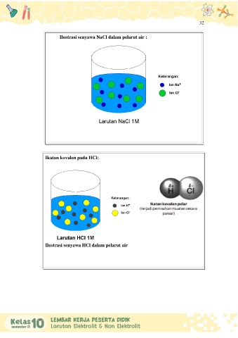 32 Ilustrasi senyawa NaCl dalam pelarut air : Ikatan kovalen pada HCl: Ilustrasi senyawa HCl dalam pelarut air