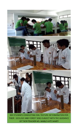 BSF STUDENTS CONDUCTING SOIL TEXTURE DETERMINATION FOR THEIR GEOLOGY AND FOREST SOILS SUBJECT WITH THE GUIDANCE OF THEIR TEACHER MS. MABLE KATE SAWEY