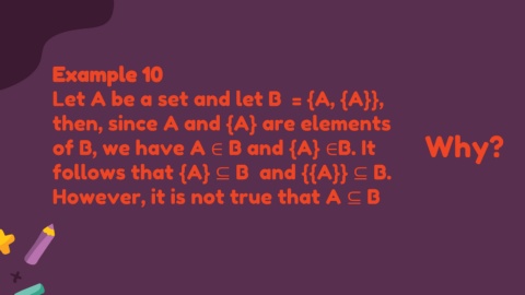 Example 10 Let A be a set and let B = {A, {A}}, then, since A and {A} are elements of B, we have A ∈ B and {A} ∈B. It Why? follows that {A} ⊆ B and {{A}} ⊆ B. However, it is not true that A ⊆ B