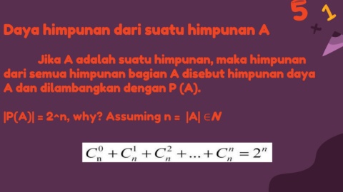 Daya himpunan dari suatu himpunan A Jika A adalah suatu himpunan, maka himpunan dari semua himpunan bagian A disebut himpunan daya A dan dilambangkan dengan P (A). |P(A)| = 2^n, why? Assuming n = |A| ∈N
