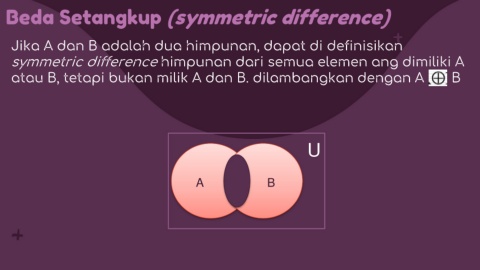 Beda Setangkup (symmetric difference) Jika A dan B adalah dua himpunan, dapat di definisikan symmetric difference himpunan dari semua elemen ang dimiliki A atau B, tetapi bukan milik A dan B. dilambangkan dengan A B U A B