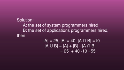 Solution: A: the set of system programmers hired B: the set of applications programmers hired, then |A| = 25, |B| = 40, |A ∩ B| =10 |A U B| = |A| + |B| - |A ∩ B | = 25 + 40 -10 =55