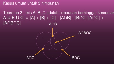 Kasus umum untuk 3 himpunan Teoroma 3 : mis A, B, C adalah himpunan berhingga, kemudian A U B U C| = |A| + |B| + |C| - |A∩B| - |B∩C|-|A∩C| + |A∩B∩C| A∩B A∩B∩C A B C A∩C B∩C