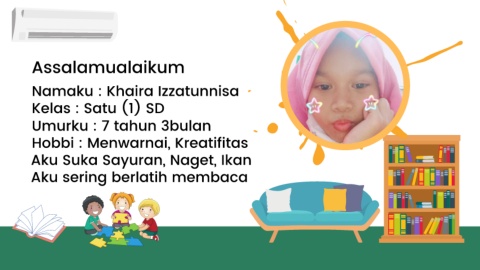 Assalamualaikum Namaku : Khaira Izzatunnisa Kelas : Satu (1) SD Umurku : 7 tahun 3bulan Hobbi : Menwarnai, Kreatifitas Aku Suka Sayuran, Naget, Ikan Aku sering berlatih membaca