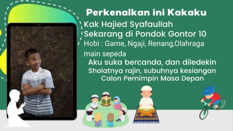 Perkenalkan ini Kakaku Kak Hajied Syafaullah Sekarang di Pondok Gontor 10 Hobi : Game, Ngaji, Renang,Olahraga main sepeda Aku suka bercanda, dan diledekin Sholatnya rajin, subuhnya kesiangan Calon Pemimpin Masa Depan