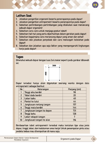 2. Jelaskan pengertian antropometri beserta penerapannya pada dapur!