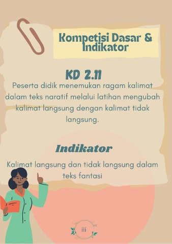 Kompetisi Dasar & Indikator KD 2.11 Peserta didik menemukan ragam kalimat dalam teks naratif melalui latihan mengubah kalimat langsung dengan kalimat tidak langsung. Indikator Kalimat langsung dan tidak langsung dalam teks fantasi iii