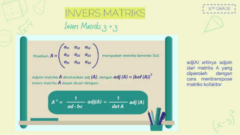 INVERS MATRIKS 11 TH GRADE Invers Matriks 3 × 3 adj(A) artinya adjoin dari matriks A yang diperoleh dengan cara mentranspose matriks kofaktor.
