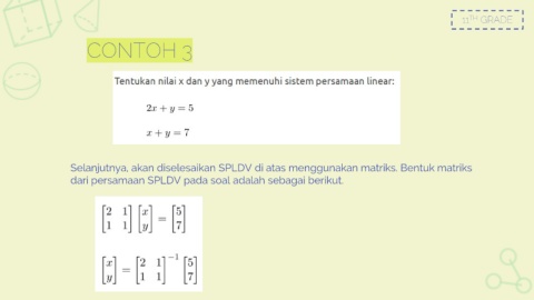11 TH GRADE CONTOH 3 Selanjutnya, akan diselesaikan SPLDV di atas menggunakan matriks. Bentuk matriks dari persamaan SPLDV pada soal adalah sebagai berikut.