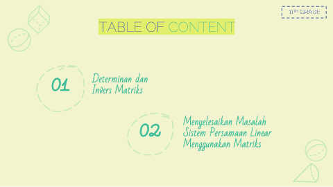 11 TH GRADE TABLE OF CONTENT 01 Determinan dan Invers Matriks 02 Menyelesaikan Masalah Sistem Persamaan Linear Menggunakan Matriks
