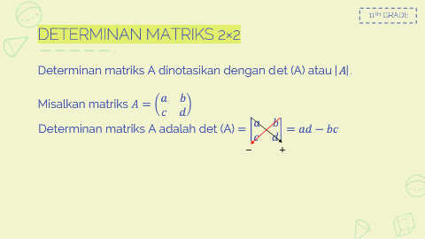 11 TH GRADE DETERMINAN MATRIKS 2×2 Determinan matriks A dinotasikan dengan det (A) atau . Misalkan matriks = Determinan matriks A adalah det (A) = = − − +