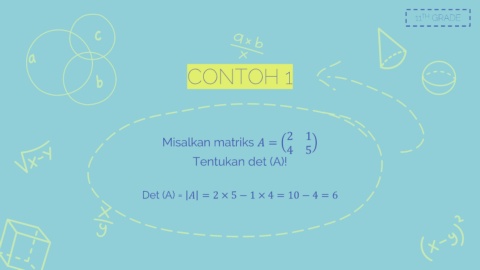 11 TH GRADE CONTOH 1 2 1 Misalkan matriks = 4 5 Tentukan det (A)! Det (A) = = 2 × 5 − 1 × 4 = 10 − 4 = 6