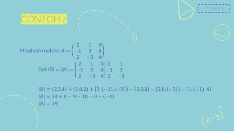 11 TH GRADE CONTOH 2 2 1 3 Misalkan matriks = −1 3 0 2 −3 4 2 1 3 2 1 Det (B) = = −1 3 0 −1 3 2 −3 4 2 −3 = 2.3.4 + 1.0.2 + 3. −1 . −3 − 3.3.2 − 2.0. −3 − 1. −1 . 4 = 24 + 0 + 9 − 18 − 0 − −4 = 19