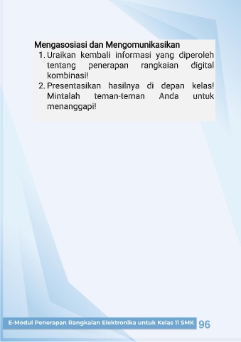 Mengasosiasi dan Mengomunikasikan 1. Uraikan kembali informasi yang diperoleh tentang penerapan rangkaian digital kombinasi! 2. Presentasikan hasilnya di depan kelas! Mintalah teman-teman Anda untuk menanggapi! 96 96