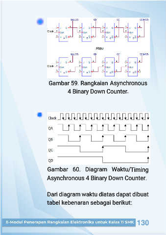 Gambar 59. Rangkaian Asynchronous . 4 Binary Down Counter Gambar 60. Diagram Waktu/Timing Asynchronous 4 Binary Down Counter. Dari diagram waktu diatas dapat dibuat tabel kebenaran sebagai berikut: 130 124