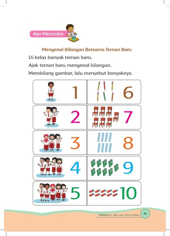 Mengenal Bilangan Bersama Teman Baru Di kelas banyak teman baru. Ajak teman baru mengenal bilangan. Membilang gambar, lalu menyebut banyaknya. 1 6 2 7 3 8 4 9 5 10 15 Subtema 1: Aku dan Teman Baru