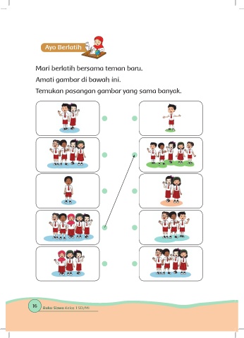 Mari berlatih bersama teman baru. Amati gambar di bawah ini. Temukan pasangan gambar yang sama banyak. 16 Buku Siswa Kelas 1 SD/MI