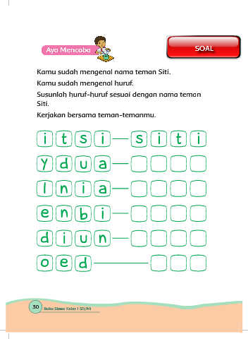 Kamu sudah mengenal nama teman Siti. Kamu sudah mengenal huruf. Susunlah huruf-huruf sesuai dengan nama teman Siti. Kerjakan bersama teman-temanmu. i t s i s i t i y d u a l n i a e n b i d i u n o e d 30 Buku Siswa Kelas 1 SD/MI