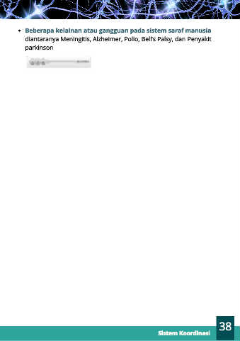 Beberapa kelainan atau gangguan pada sistem saraf manusia diantaranya Meningitis, Alzheimer, Polio, Bell’s Palsy, dan Penyakit parkinson Pia mater 38 Sistem Koordinasi