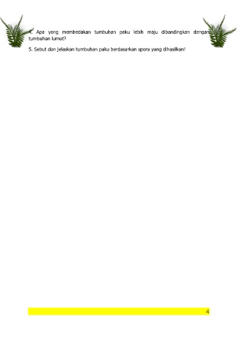 4. Apa yang membedakan tumbuhan paku lebih maju dibandingkan dengan tumbuhan lumut? 5. Sebut dan jelaskan tumbuhan paku berdasarkan spora yang dihasilkan! 4