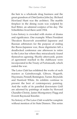 Lotos history is crowded with stories of drama and signi cance. One example: When President Theodore Roosevelt assembled Japanese and Russian arbitrators for the purpose of ending the Russo-Japanese war, those dignitaries left a deadlocked conference one afternoon to retire to the Lotos bar where they miraculously found themselves agreeing. Shortly afterwards, points of agreement reached in the clubhouse were incorporated in the Treaty of Portsmouth, which ended the war.