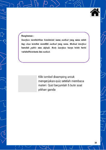 Rangkuman : Interface membertikan konsistensi nama method yang sama untuk tiap class tersebut memiliki method yang sama. Method interface haruslah public atau default. Body interface hanya boleh berisi variabel/konstanta dan method. 20