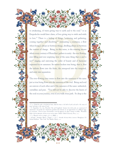 to awakening, of water giving way to earth and to the soul,15 or as Empedocles would later claim, of love giving way to strife and strife to love.16 There is a feeling of things “scattering and gathering, coming together and dissolving”17 insinuating a constancy, a flow where being is always in-between things, dwelling always in-between the current of change. Being, in this sense, is the running stream where every contrary of Heraclitus’ gathers in unity: the ever flowing, ever filling and ever emptying river of the same thing that is and is not18 singing and mirroring the order of beauty and of harmony expressed in its sameness. Its waters beckon true being, that is, that the infinite flows into the finite, the atemporal into the temporal, and unity into separation.