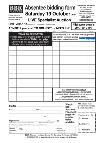 2024 Saturday 19 October 2025 ADVISE if you wish TO COLLECT or NEED P&P LIVE Specialist Auction NEW buyers comm’n 20% + vat = 24%