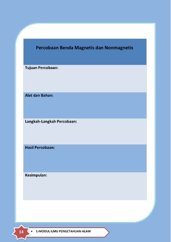 Percobaan Benda Magnetis dan Nonmagnetis Tujuan Percobaan: Alat dan Bahan: Langkah-Langkah Percobaan: Hasil Percobaan: Kesimpulan: 14 E-MODUL ILMU PENGETAHUAN ALAM