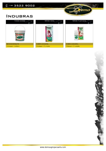 (18) 3522 9002 Indubras Tanicid 2000g Vermex 20ml Vermex Plus 20ml MATA BICHEIRAS PO VERMIF./CAES/ORAL VERMIF./CAES/ORAL Embalagem: 4 unidades Embalagem: 25 unidades Embalagem: 25 unidades www.domaagropecuaria.com
