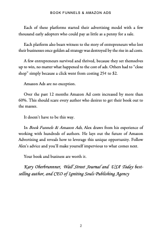 In Book Funnels & Amazon Ads, Alex draws from his experience of working with hundreds of authors. He lays out the future of Amazon Advertising and reveals how to leverage this unique opportunity. Follow Alex’s advice and you’ll make yourself impervious to what comes next.
