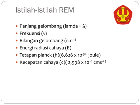 Istilah-Istilah REM Panjang gelombang (lamda = λ) Frekuensi (v) Bilangan gelombang (cm -1) Energi radiasi cahaya (E) Tetapan planck (h)(6,626 x 10 -34 joule) 10 Kecepatan cahaya (c)( 2,998 x 10 cms -1 )