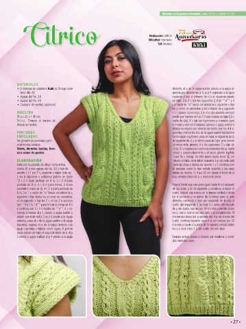y continúa con 3 r, 2 d tejidos de **a**, 4 r, co- de p del cuello, teje así por 19 cm más y remata todos