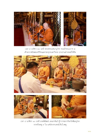 เวลำ ๙ นำฬิกำ ๑๐ นำที พระธรรมเสนำนุวัตร รองเจ้ำคณะภำค ๕ เจ้ำอำวำสวัดพระศรีรัตนมหำธำตุวรมหำวิหำร ประธำนฝ่ำยสงฆ์ให้ศีล เวลำ ๙ นำฬิกำ ๔๐ นำที นำยพิพัฒน์ เอกภำพันธ์ ผู้ว่ำรำชกำรจังหวัดพิษณุโลก ถวำยใบพลู ๗ ใบ แด่ประธำนสงฆ์เจิมใบพลู ๒๙๑