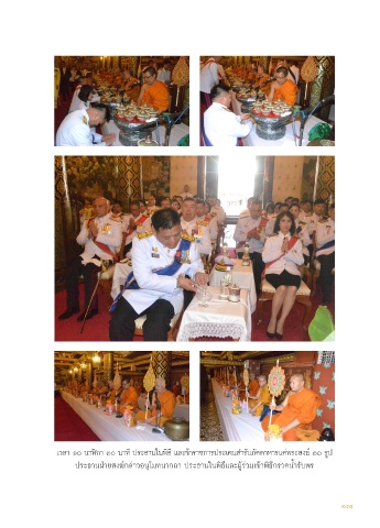 เวลำ ๑๐ นำฬิกำ ๓๐ นำที ประธำนในพิธี และข้ำรำชกำรประเคนส�ำรับภัตตำหำรแด่พระสงฆ์ ๓๐ รูป ประธำนฝ่ำยสงฆ์กล่ำวอนุโมทนำกถำ ประธำนในพิธีและผู้ร่วมเข้ำพิธีกรวดน�้ำรับพร ๒๙๗