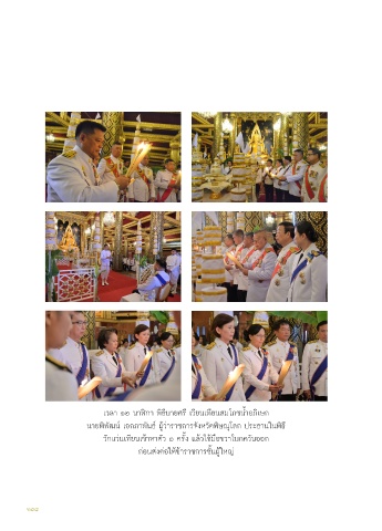 เวลำ ๑๒ นำฬิกำ พิธีบำยศรี เวียนเทียนสมโภชน�้ำอภิเษก นำยพิพัฒน์ เอกภำพันธ์ ผู้ว่ำรำชกำรจังหวัดพิษณุโลก ประธำนในพิธี วักแว่นเทียนเข้ำหำตัว ๓ ครั้ง แล้วใช้มือขวำโบกควันออก ก่อนส่งต่อให้ข้ำรำชกำรชั้นผู้ใหญ่ ๒๙๘