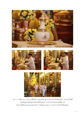 เวลำ ๘ นำฬิกำ ๒๐ นำที นำยพิพัฒน์ เอกภำพันธ์ ผู้ว่ำรำชกำรจังหวัดพิษณุโลก ประธำนในพิธี อัญเชิญคนโทน�้ำอภิเษกจังหวัดพิษณุโลก จำกพระวิหำรพระพุทธชินรำช วัดพระศรีรัตนมหำธำตุวรมหำวิหำร ไปยังจุดรวมพล ณ ศำลำกลำงจังหวัดพิษณุโลก ๓๐๑