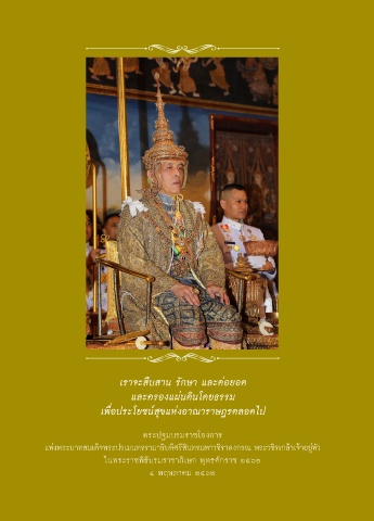 " เราจะสืบสาน รักษา และต่อยอด และครองแผ่นดินโดยธรรม ื เพ่อประโยชน์สุขแห่งอาณาราษฎรตลอดไป พระปฐมบรมรำชโองกำร แห่งพระบำทสมเด็จพระปรเมนทรรำมำธิบดีศรีสินทรมหำวชิรำลงกรณ พระวชิรเกล้ำเจ้ำอยู่หัว ในพระรำชพิธีบรมรำชำภิเษก พุทธศักรำช ๒๕๖๒ ๔ พฤษภำคม ๒๕๖๒