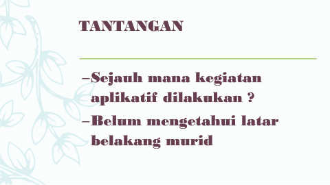TANTANGAN –Sejauh mana kegiatan aplikatif dilakukan ? –Belum mengetahui latar belakang murid