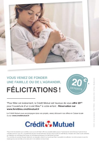 Livret Bleu avant le 31 mars 2027, sur présentation de votre Livret de famille dans l’une des Caisses locales du Crédit Mutuel, à l’exception des Caisses locales adhérentes