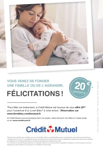 et responsable de l’enfant. familial, comme les Associations sportives, *Pour fêter cet événement, le Crédit Mutuel est heureux de vous offrir 20 €(1) CNCM - 46 rue du Bastion - 75017 PARIS - Décembre 2024 - © Photo : Shutterstock