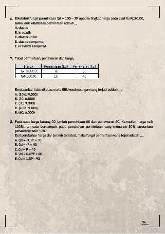 6. Diketahui fungsi permintaan Qd = 100 – 2P apabila tingkat harga pada saat itu Rp20,00,