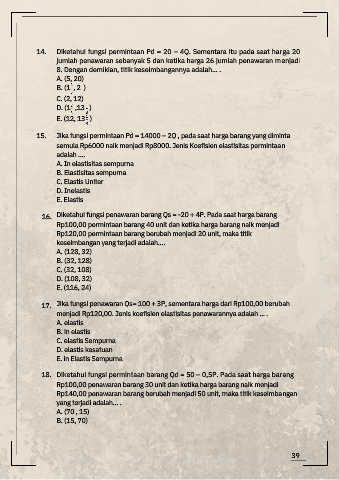 14. Diketahui fungsi permintaan Pd = 20 – 4Q. Sementara itu pada saat harga 20
