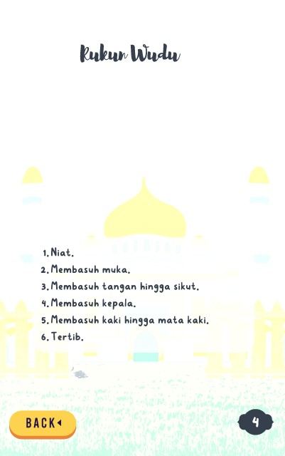 Rukun Wudu 1. Niat. 2. Membasuh muka. 3. Membasuh tangan hingga sikut. 4. Membasuh kepala. 5. Membasuh kaki hingga mata kaki. 6. Tertib. 4